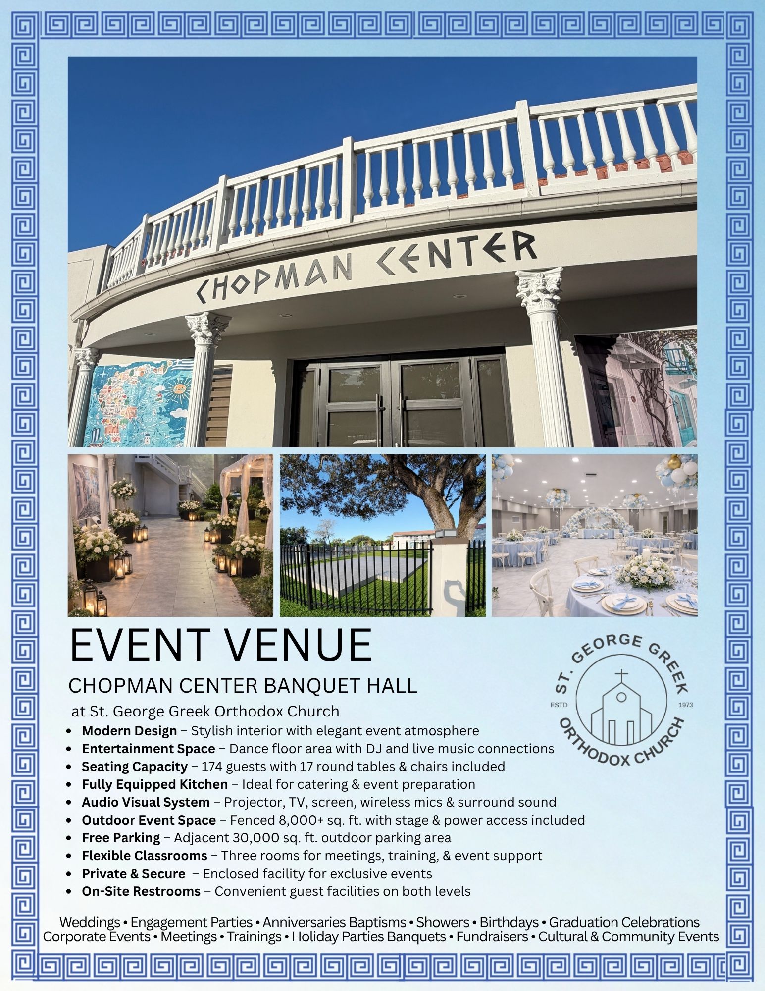 From celebrations like weddings, birthdays, and baptisms to corporate meetings, fundraisers, and community events, the Chopman Center provides a private and welcoming setting designed to accommodate a wide variety of occasions.