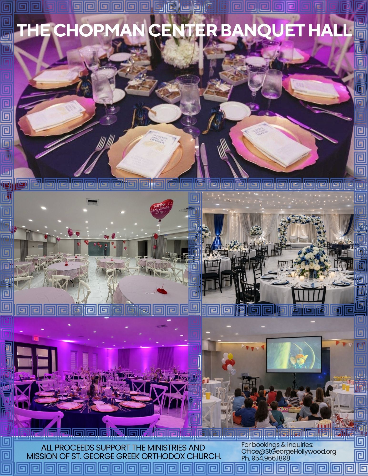 The Chopman Center Banquet Hall offers a beautiful and welcoming event venue in the heart of Hollywood, Florida, ideal for hosting both elegant celebrations and professional gatherings. The stylish indoor banquet hall has audio-visual capabilities including a projector, wireless microphones, screen, and built-in surround sound.